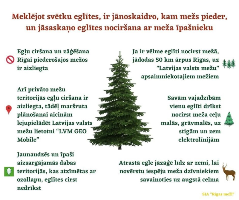 Ziemassvētku eglītes cirst un zāģēt Rīgas mežos un jaunaudzaudzēs, kā arī privātajos mežos ir aizliegts, tāpēc atrast egli iespējams 50 km ārpus Rīgas - “Latvijas valsts mežu” apsaimniekotajās teritorijās