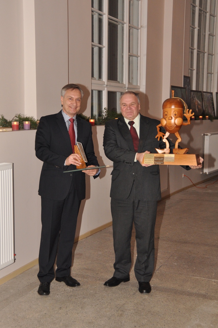 Attēlā: pa kreisi - SIA "Rīgas meži" valdes priekšsēdētājs Aivars Tauriņš, pa labi - Daugavas mežniecības mežzinis Edvīns Ģērmanis ar ceļojošo balvu - Zīļuku, kurš nākamo gadu pavadīs Daugavas mežniecībā.