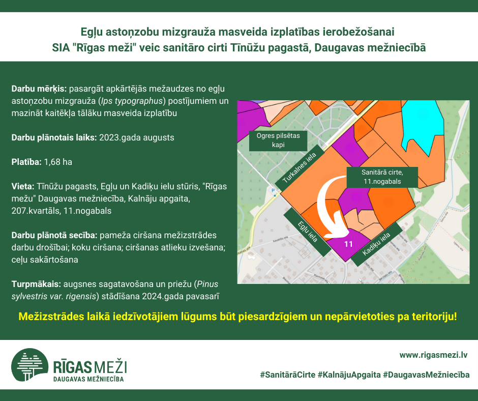 Lai pasargātu apkārtējās mežaudzes no egļu astoņzobu mizgrauža (Ips typographus) postījumiem un lai mazinātu kaitēkļa tālāku masveida izplatību, SIA “Rīgas meži” augustā plāno sanitāro cirti Tīnūžu pagastā, meža masīvā Egļu un Kadiķu ielu stūrī. Šajā “Rīgas mežu” Daugavas mežniecības masīvā konstatēti būtiski mizgrauža bojājumi. Savukārt nākamajā pavasarī mežaudzi plānots atjaunot, iestādot priedes (Pinus sylvestris var. rigensis).