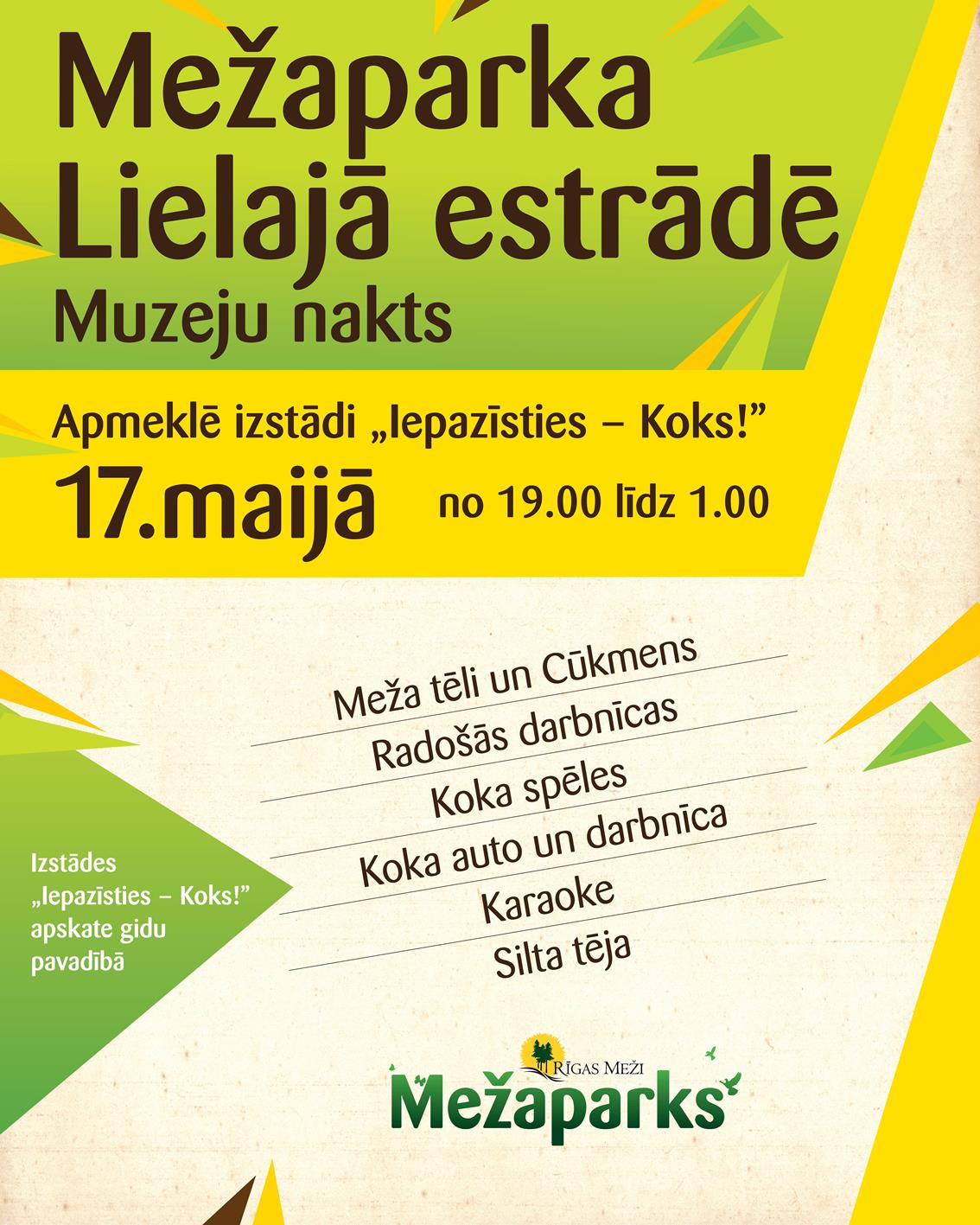 17. maijā visā Latvijā jau desmito reizi ar daudzveidīgu programmu notika akcija "Muzeju nakts", kurā jau trešo gadu piedalījās arī Latvijas lielākie meža nozares pārstāvji - AS "Latvijas valsts meži", SIA "Rīgas meži", Latvijas Kokrūpniecības federācija, vairākas Latvijas universitātes un citu izglītības programmu pārstāvji. Interesenti tika aicināti aplūkot "Mežaparka" Lielajā estrādē apskatāmo izstādi "Iepazīsties – Koks!", kā arī darboties radošajās darbnīcās un daudzās citās interesantās aktivitātēs. Šā gada "Muzeju nakts" tēma bija „Dzintars – sarkanā krāsa”, bet izstādē bija apskatāms Dzintara pirmsākums – Koks.