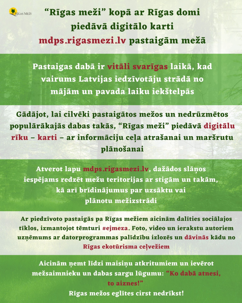 Pastaigas dabā ir vitāli svarīgas laikā, kad vairums Latvijas iedzīvotāju strādā no mājām un pavada laiku telpās. Gādājot, lai cilvēki pastaigātos dabiskos mežos un nedrūzmētos populārākajās dabas takās, “Rīgas meži” piedāvā digitālu rīku ar informāciju maršrutu plānošanai. Atverot lapu mdps.rigasmezi.lv, dažādos slāņos iespējams redzēt mežu teritorijas ar stigām un takām, kā arī brīdinājumus par uzsāktu vai plānotu mežizstrādi.