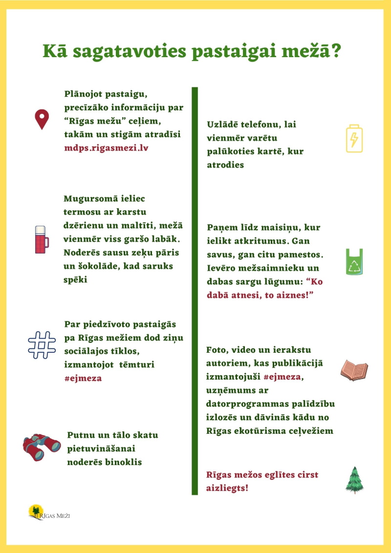 Aicinām ņemt līdzi maisiņu atkritumiem un ievērot mežsaimnieku un dabas sargu lūgumu: “Ko dabā atnesi, to aiznes!” Atgādinām, ka Rīgas mežos eglītes cirst nedrīkst.