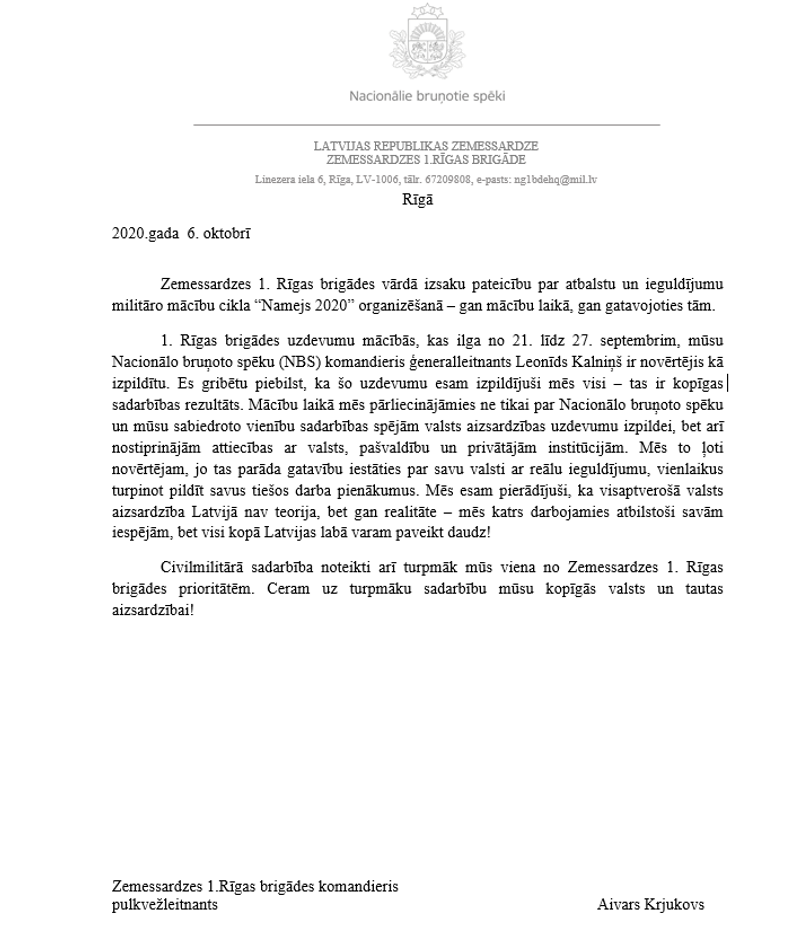 Zemessardzes 1. Rīgas brigādes vārdā komandieris pulkvežleitnants Aivars Krjukovs izsaka pateicību SIA “Rīgas Meži” par atbalstu un ieguldījumu militāro mācību cikla “Namejs 2020” organizēšanā – gan mācību laikā, gan gatavojoties tām. Mācības ilga no 21. līdz 27. septembrim, un viena no to dislokācijas vietām bija Rīgai piederošie meži.
