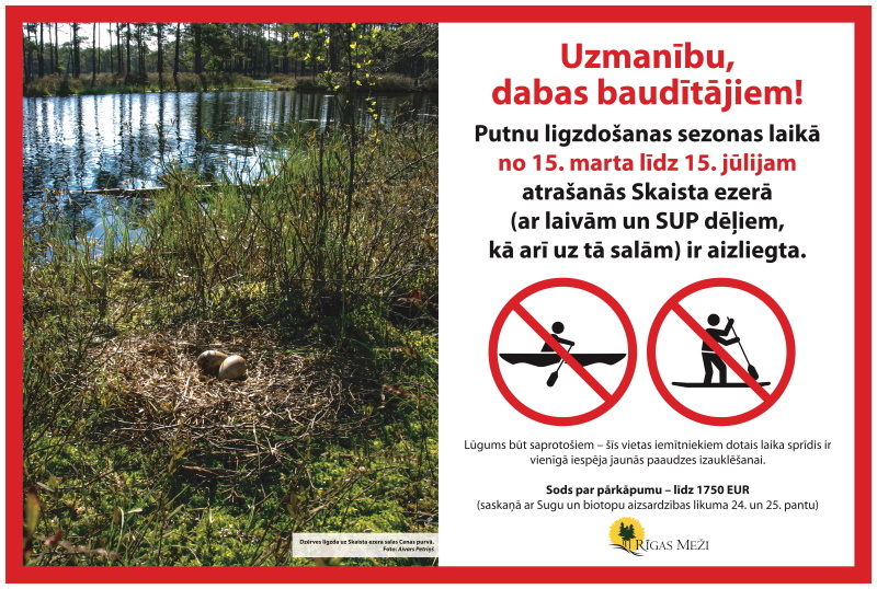 Skaista ezerā (Mārupes novads, Babītes pagasts, Cenas tīreļa dabas liegums) putni turpina ligzdot. Tādēļ līdz 15. jūlijam ar laivām un SUP dēļiem ezerā atrasties ir aizliegts.