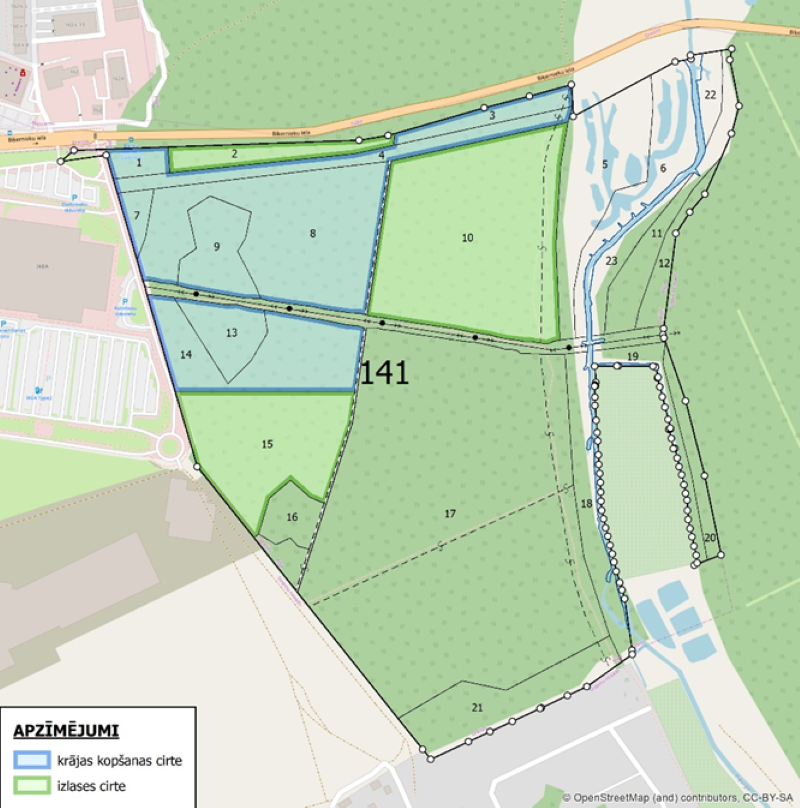 Meža izstrādes darbu laikā tiks cirsti koki krājas kopšanas un izlases ciršu veidā. Ciršu laikā tiks cirsti augšanā atpalikušie un slimību invadētie koki, kā arī retināta esošā mežaudze. Darbi nodrošinās optimālus augšanas apstākļus spēcīgākajiem kokiem, dodot tiem vairāk gaismas un vietas, lai attīstītos stiprāka un pret ārējiem vides un bioloģiskiem faktoriem noturīgāka mežaudze. Vienlaicīgi tiks uzlabota meža vides rekreatīvā vērtība, kā arī nodrošināta iespēja plašākai bioloģiskās daudzveidības attīstībai arī meža zemsedzē. Zarus un citus ciršanas atlikumus darba gaitā un pēc darbu pabeigšanas iespēju robežās paredzēts no meža izvest. Esošie meža celiņi pēc darbu pabeigšanas tiks sakārtoti vismaz stāvoklī, kādā tie bija pirms mežizstrādes uzsākšanas.